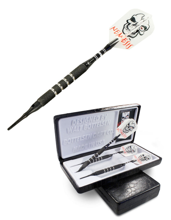 All of the Nemesis™ 90% tungsten dart line features our Black Steal™ coating. The Black Steal™ tungsten oxide finish gives this dart an exceptional look and feel.